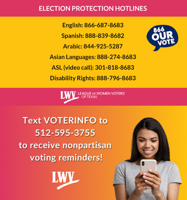About the League of Women Voters of Texas: The League of Women Voters is one of America’s oldest and most trusted civic nonprofit organizations. Formed in 1919, the Texas League represents more than 25,000 grassroots advocates and 34 local Leagues across the state. The League never supports or opposes candidates for office or political parties. The League encourages the informed and active participation of citizens in government. The League also seeks to influence public policy through education and advocacy. Membership is open to people 16 years and older. Learn more about the League of Women Voters of Texas at LWVTexas.org.